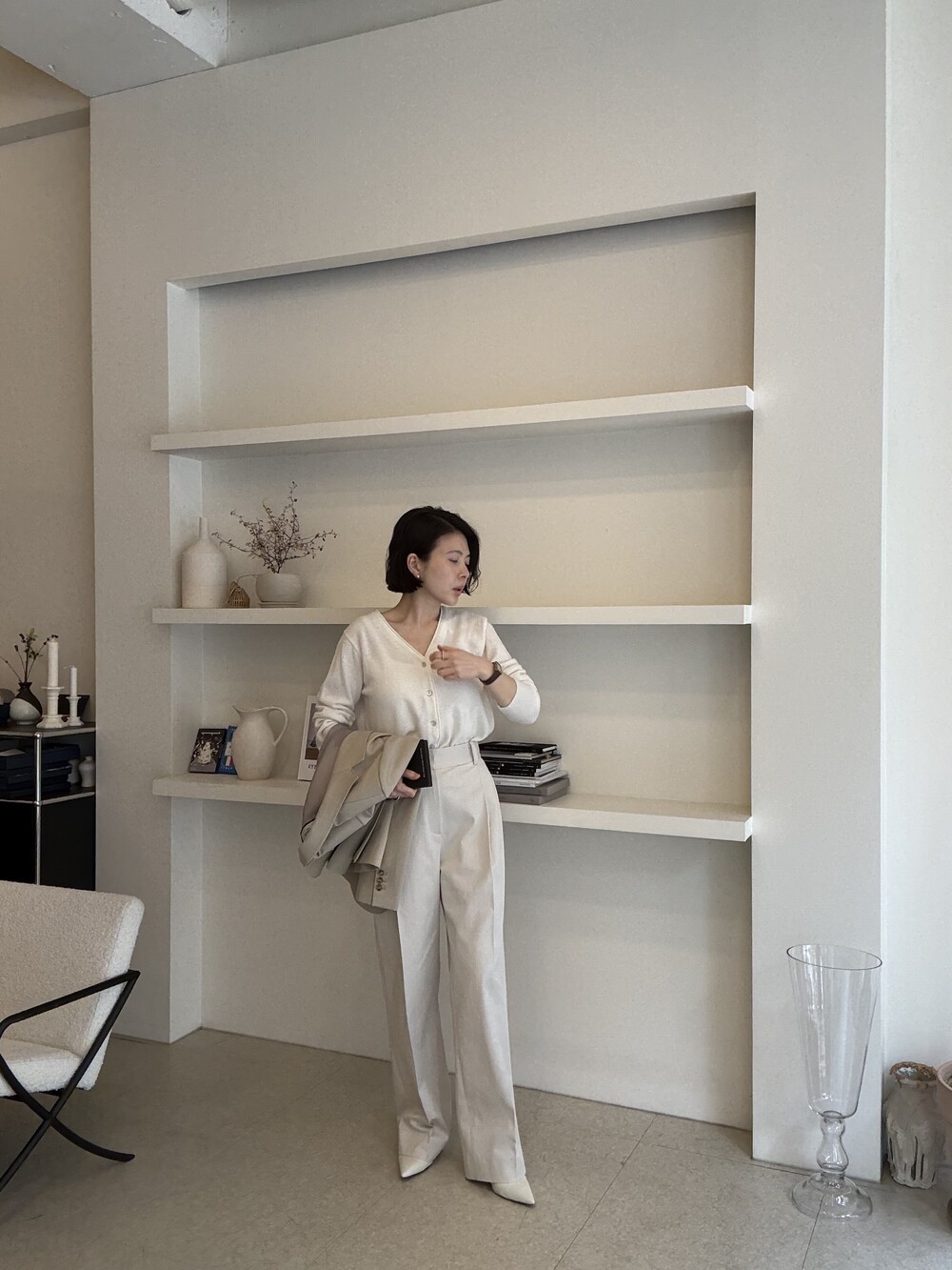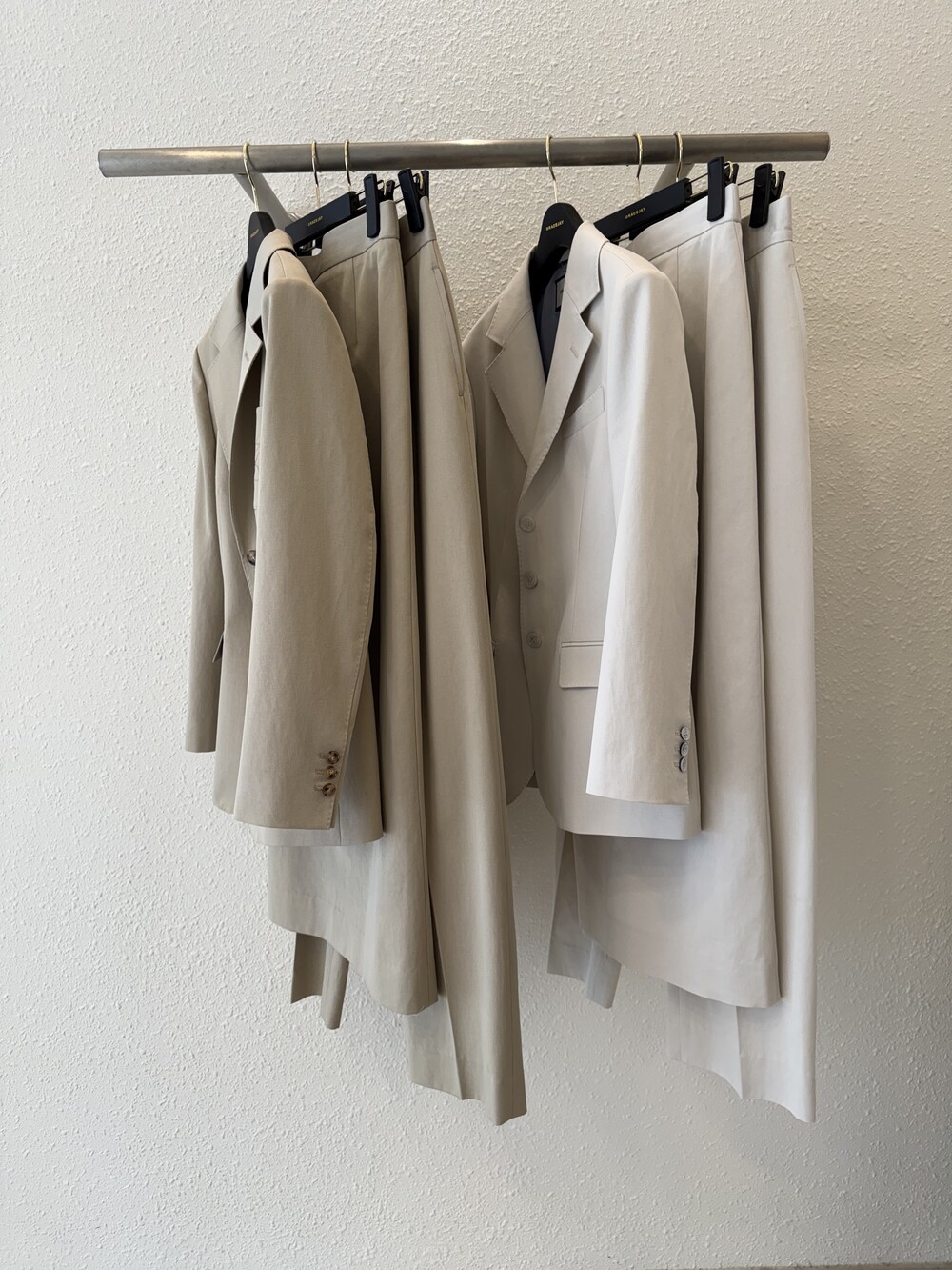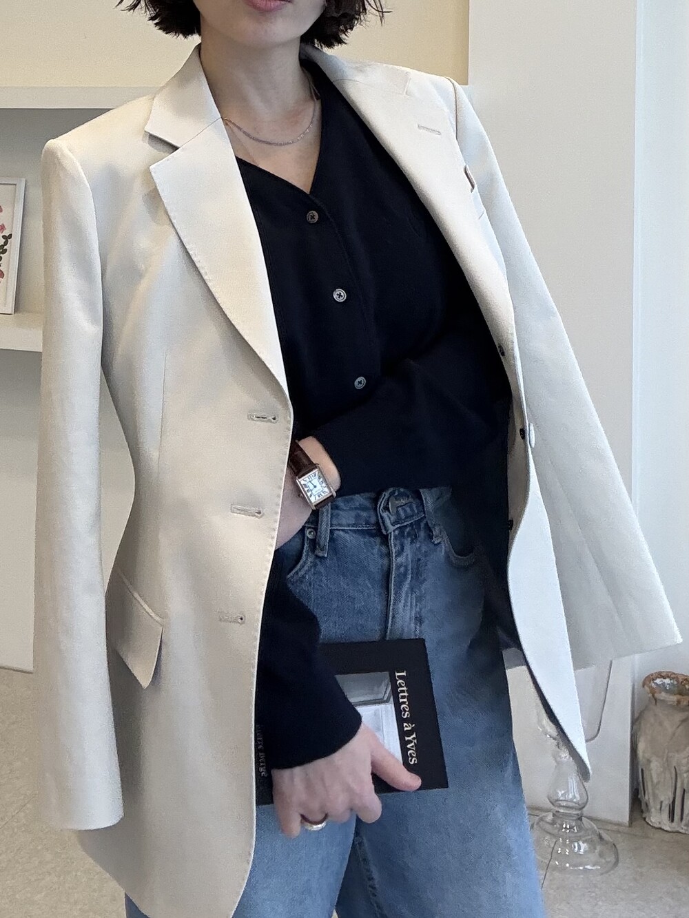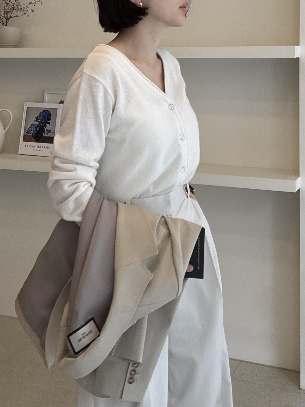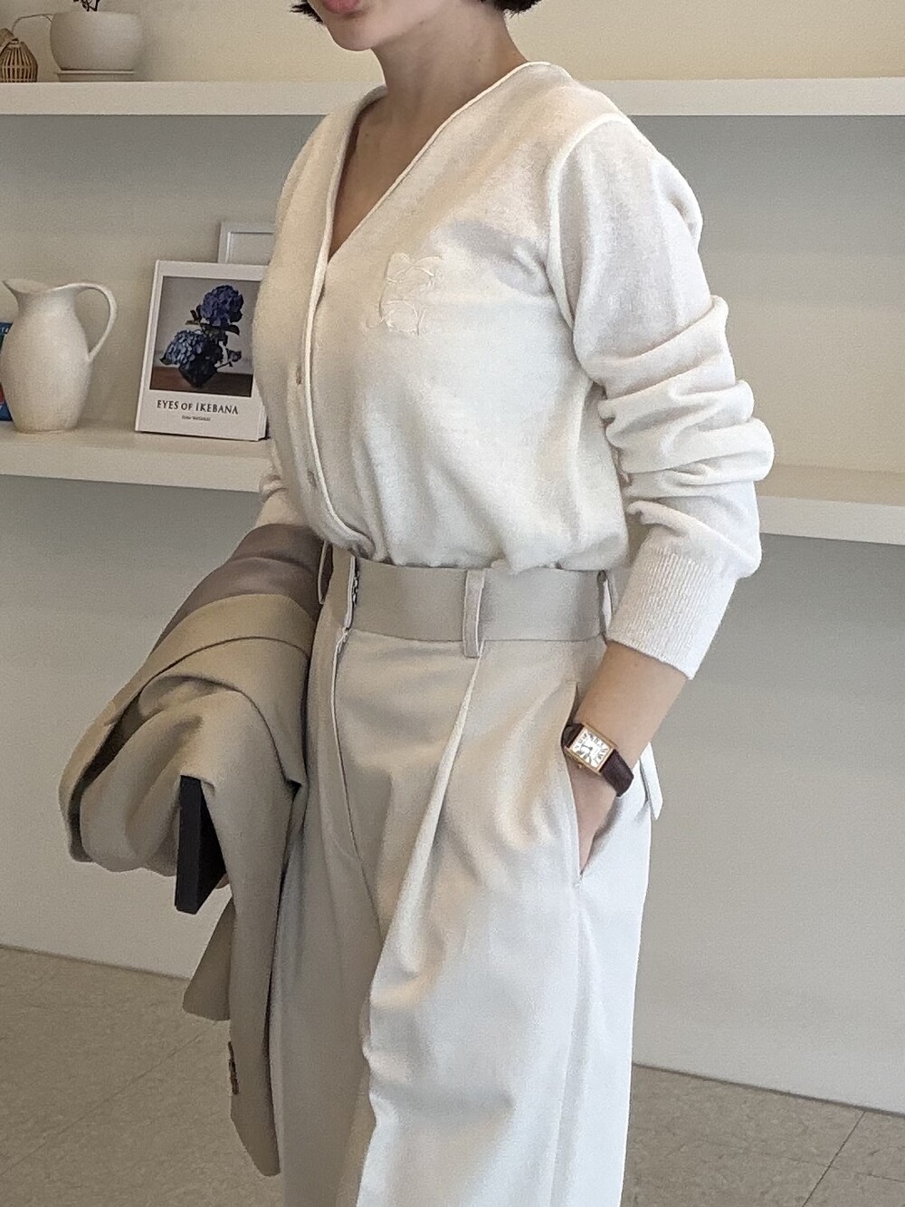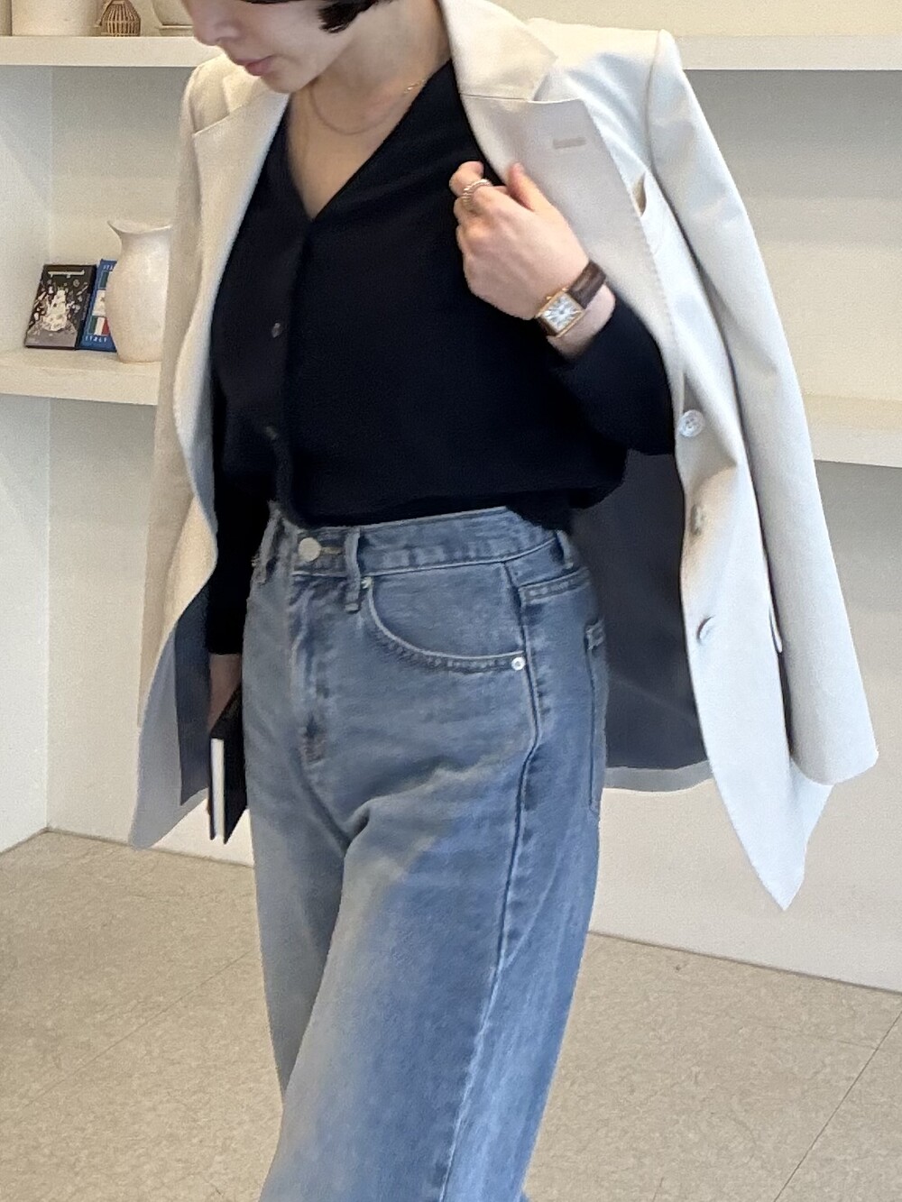 허리라인이 부각되었으며, 이번 크림색의 3버튼은 너치드 라펠 디자인으로 제안됩니다.