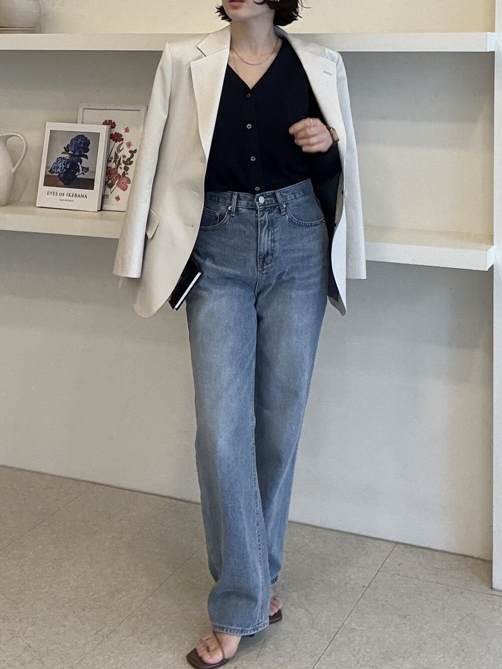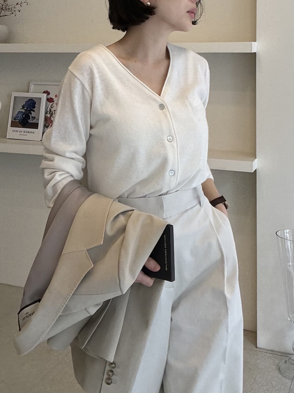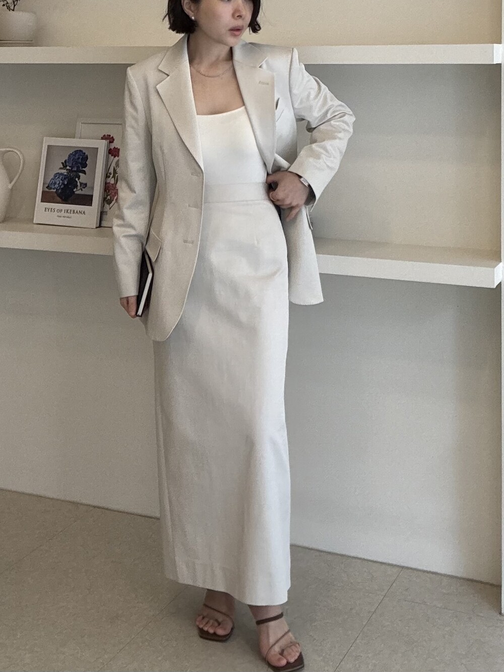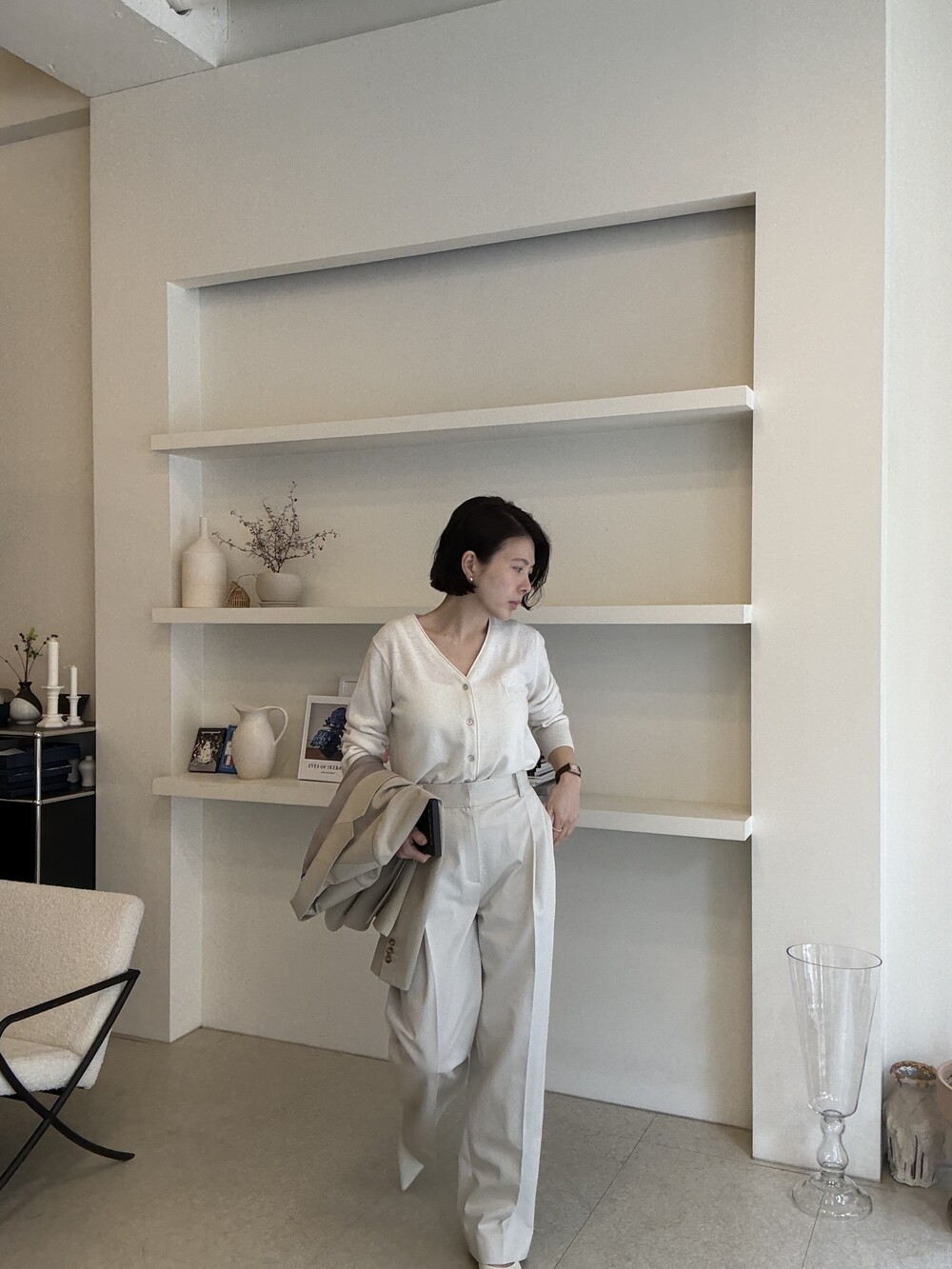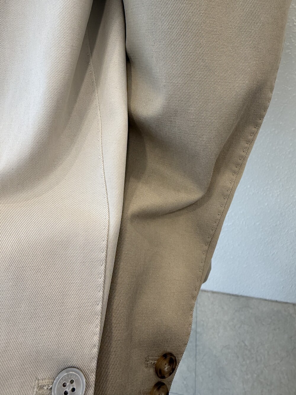 허리라인이 부각되었으며, 이번 크림색의 3버튼은 너치드 라펠 디자인으로 제안됩니다.