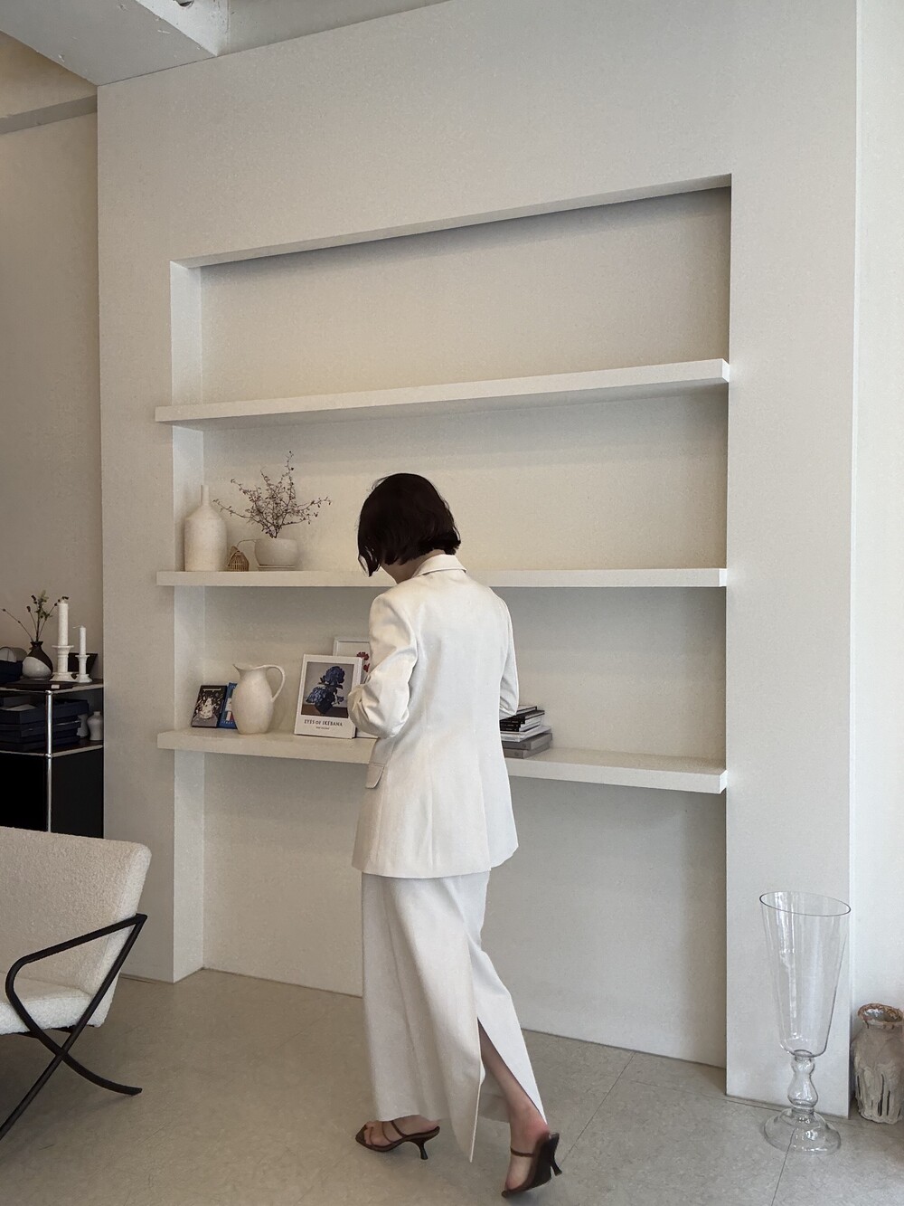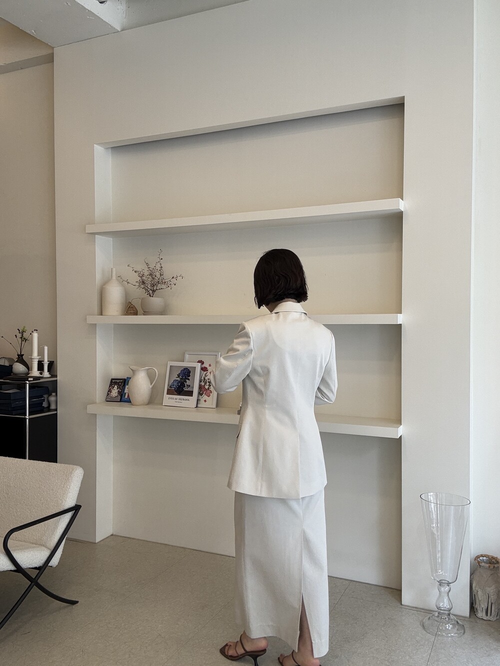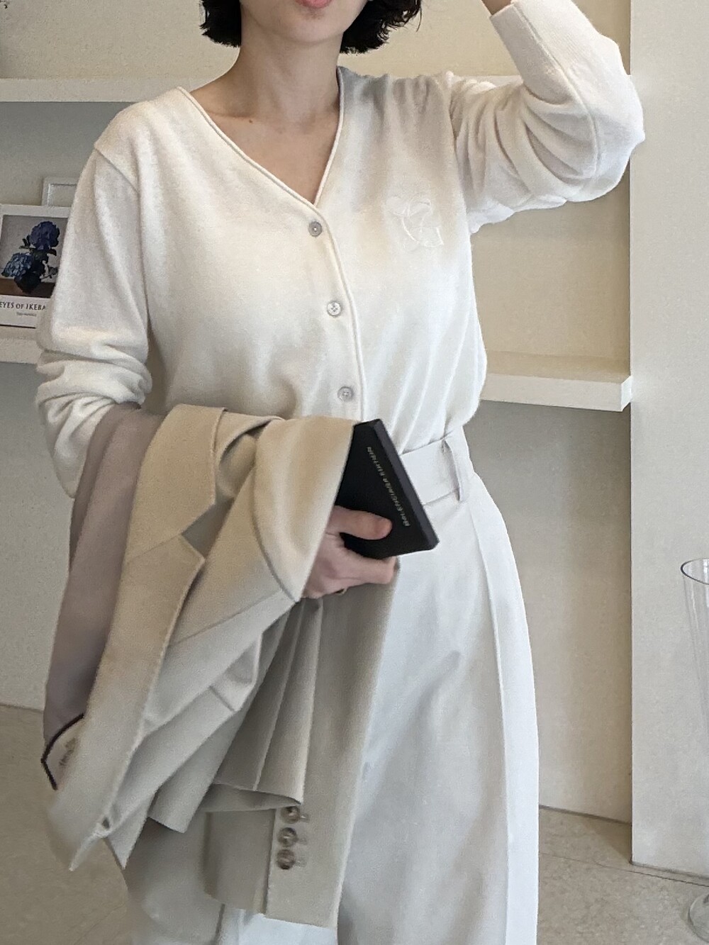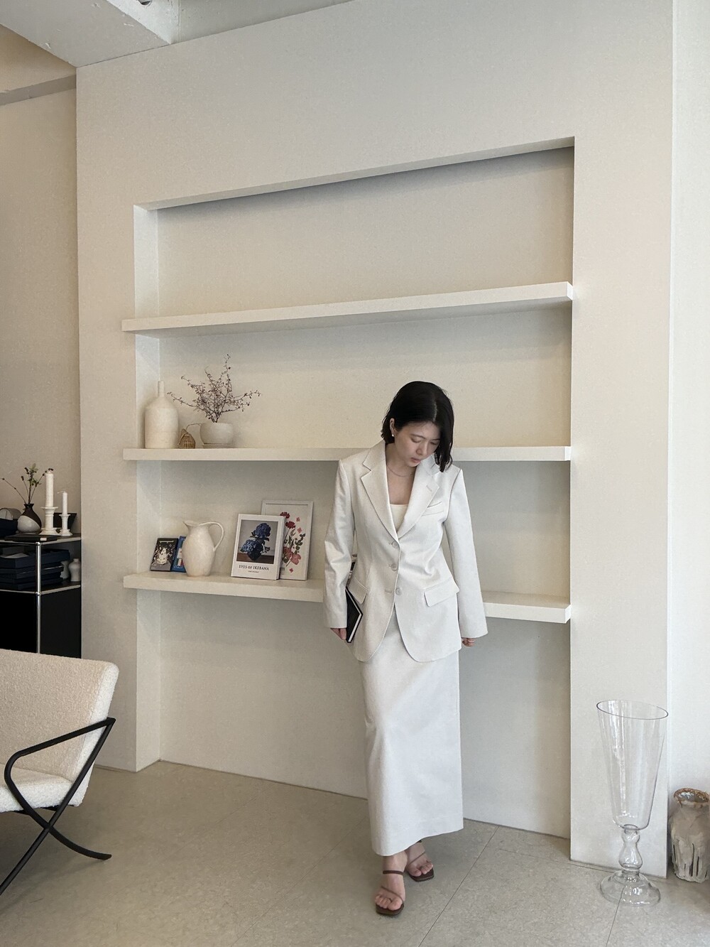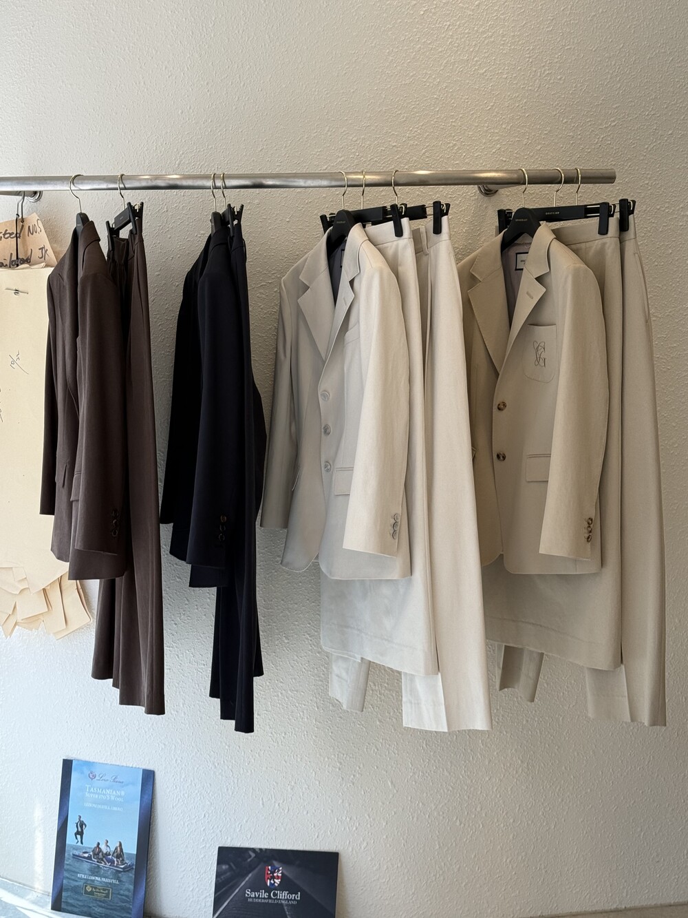 허리라인이 부각되었으며, 이번 크림색의 3버튼은 너치드 라펠 디자인으로 제안됩니다.