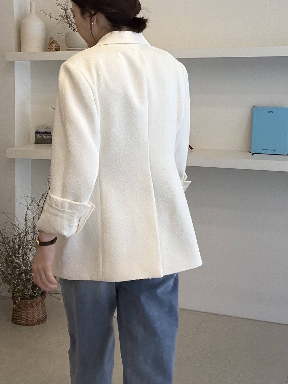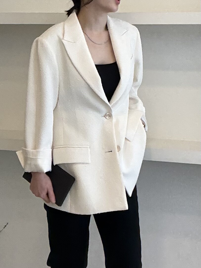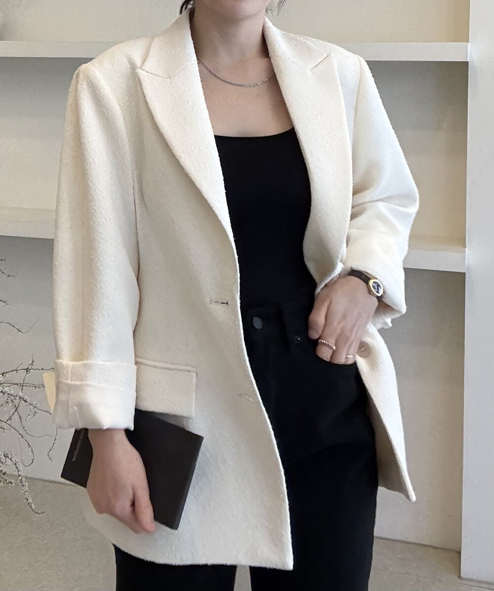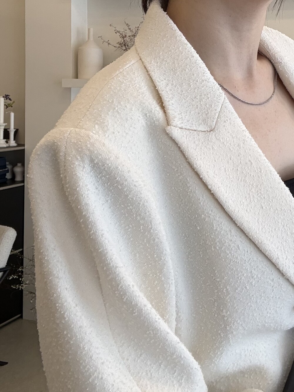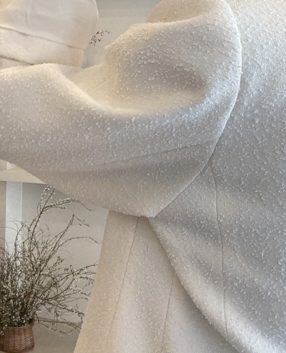 그런데 이번 26ss에서는 수입소재를 모티브로한 국내 개발 소재도 이따금씩 소개될 예정에 있어요. 이 또한 틈틈이 보내주시는 고객분들의 의견들로 만들어진 프로젝트라서 같은 마음으로 기다려 주셨던 분들은 즐겁게 즐겨주세요. 이번 크림컬러로 선보이는 소재는 독특한 외관을 가지고 있는 이태리 Casentino 소재를 모티브로 국내에서 개발된 소재입니다. 부클처럼 은은한 느낌이 어떻게 보면 보풀처럼 보이기도 하죠. 그 외관이 시그니처인 소재를 아시는 분들께는 더 반갑게 느껴지실거에요.