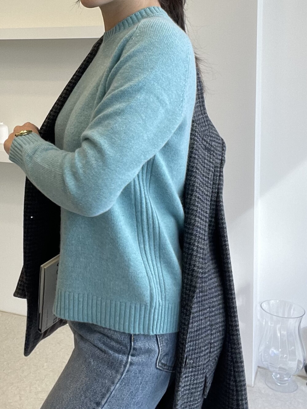 작년에 보여드린 라운드넥 니트보다 약간 더 여유가 있고 옆선에는 포인트 조직감이 추가 되었습니다.