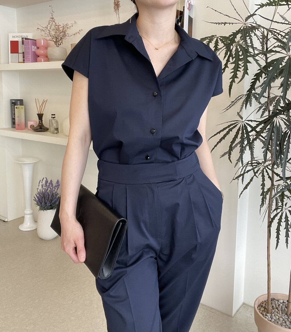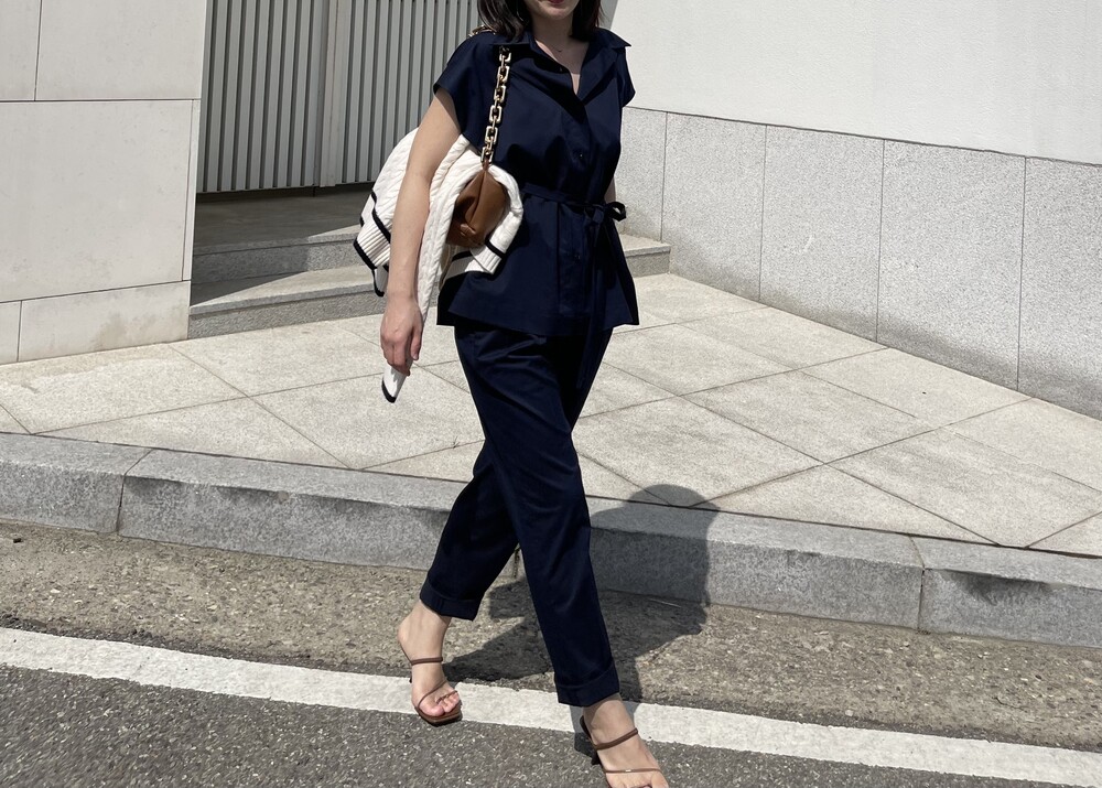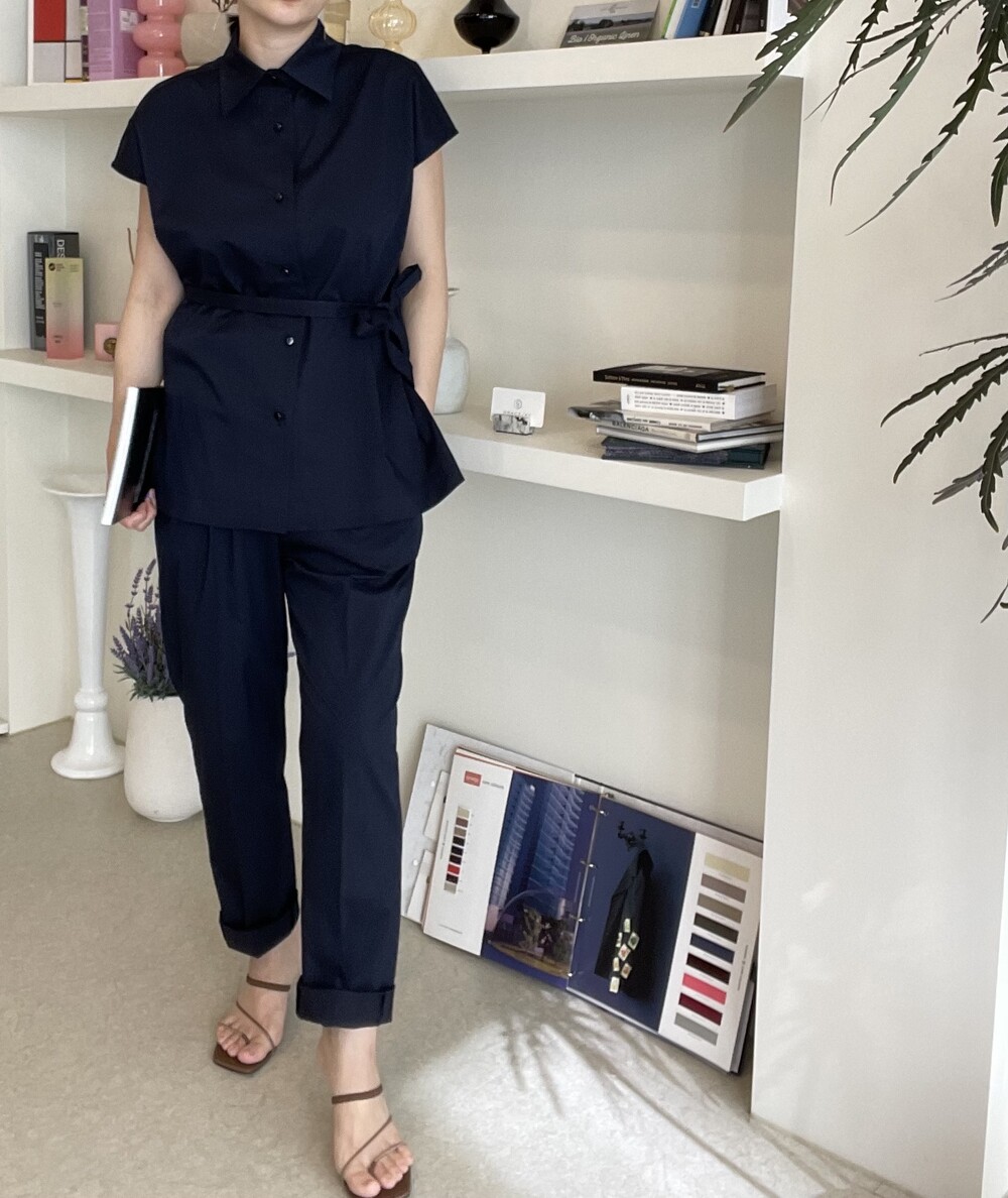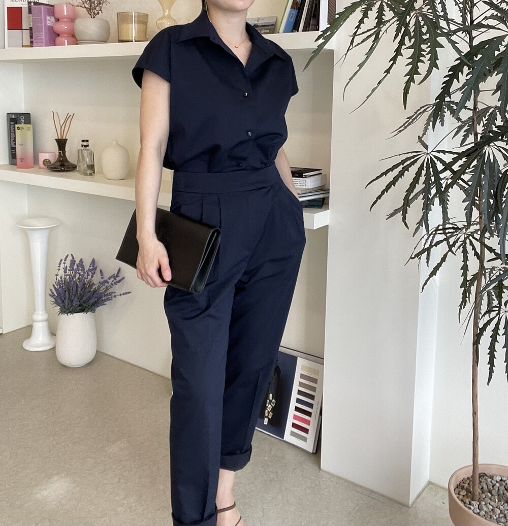 하나의 옷으로 캐쥬얼하게 그리고 무더운 여름에도 단정한 셋업룩이 필요하실때마다 여러가지 연출로 귀하게 잘 입어지실거에요. 컬러는 오션네이비 컬러로 많이 파랗지 않으며, 얼굴톤을 화사하게 잡아주는 톤 다운된 안정감 있는 네이비 컬러로 진행됩니다.