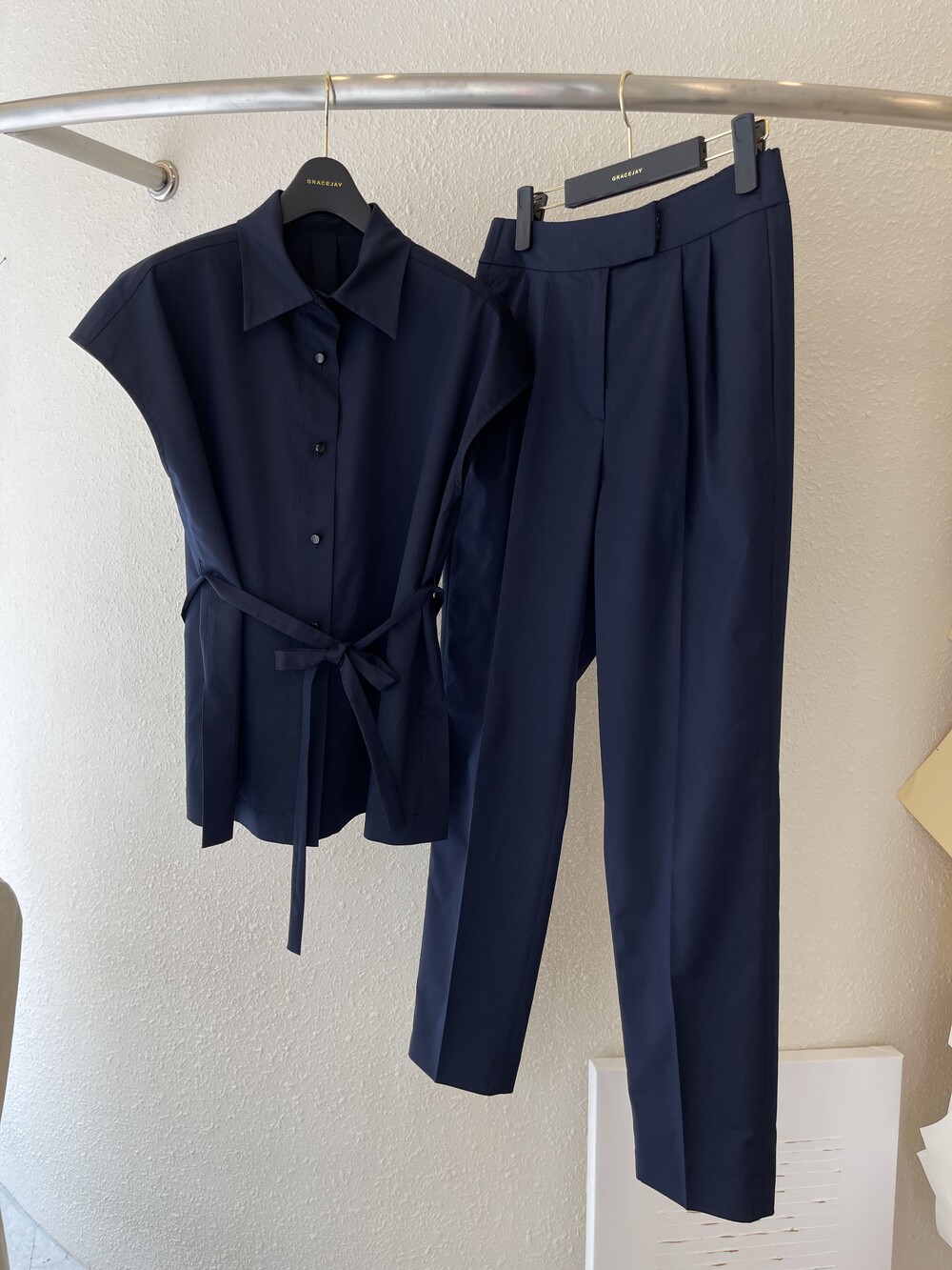 셔츠는 힙을 어느정도 덮어주는 길이감이라서 내어 입기에도 좋고 같은 원단의 제원단 끈이 포함되어 또 다른 활용이 많이 되실거에요. 팬츠 역시 그레이스제이의 시그니처 2턱 테이퍼드 라인으로 보다 편하고 이지하게 입으실수 있는 팬츠로 진행됩니다. 뒷 허리에는 살짝 밴딩이 들어가서 더 편한 웨어링을 느끼 실 수 있어요.