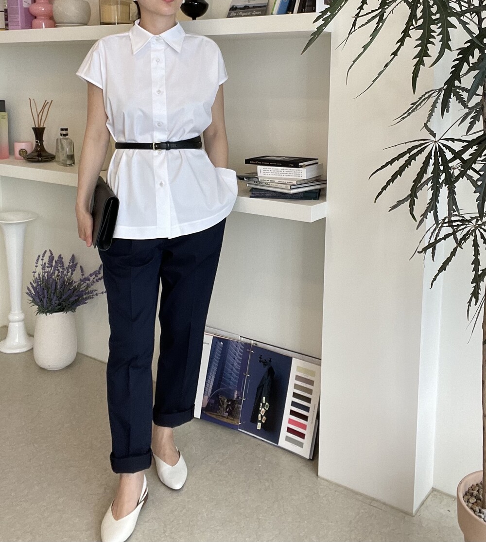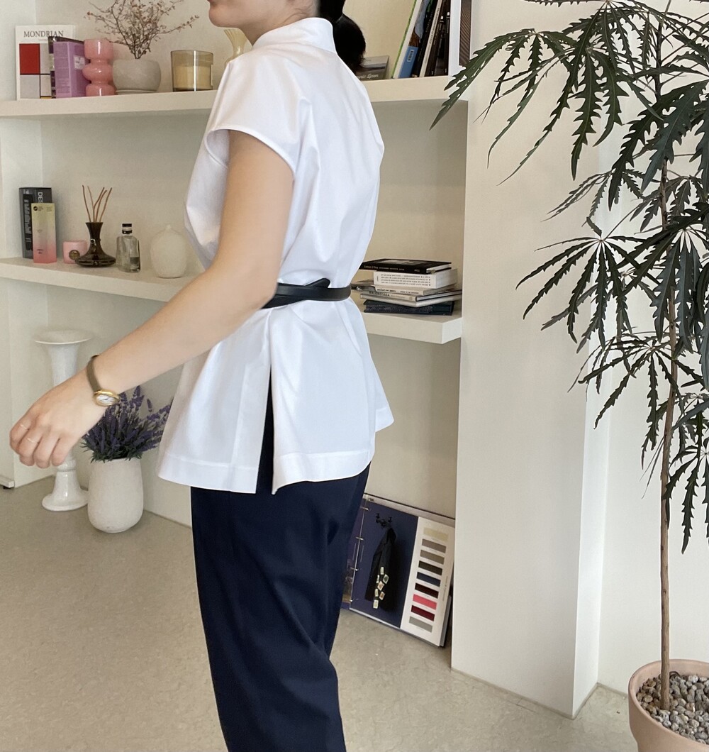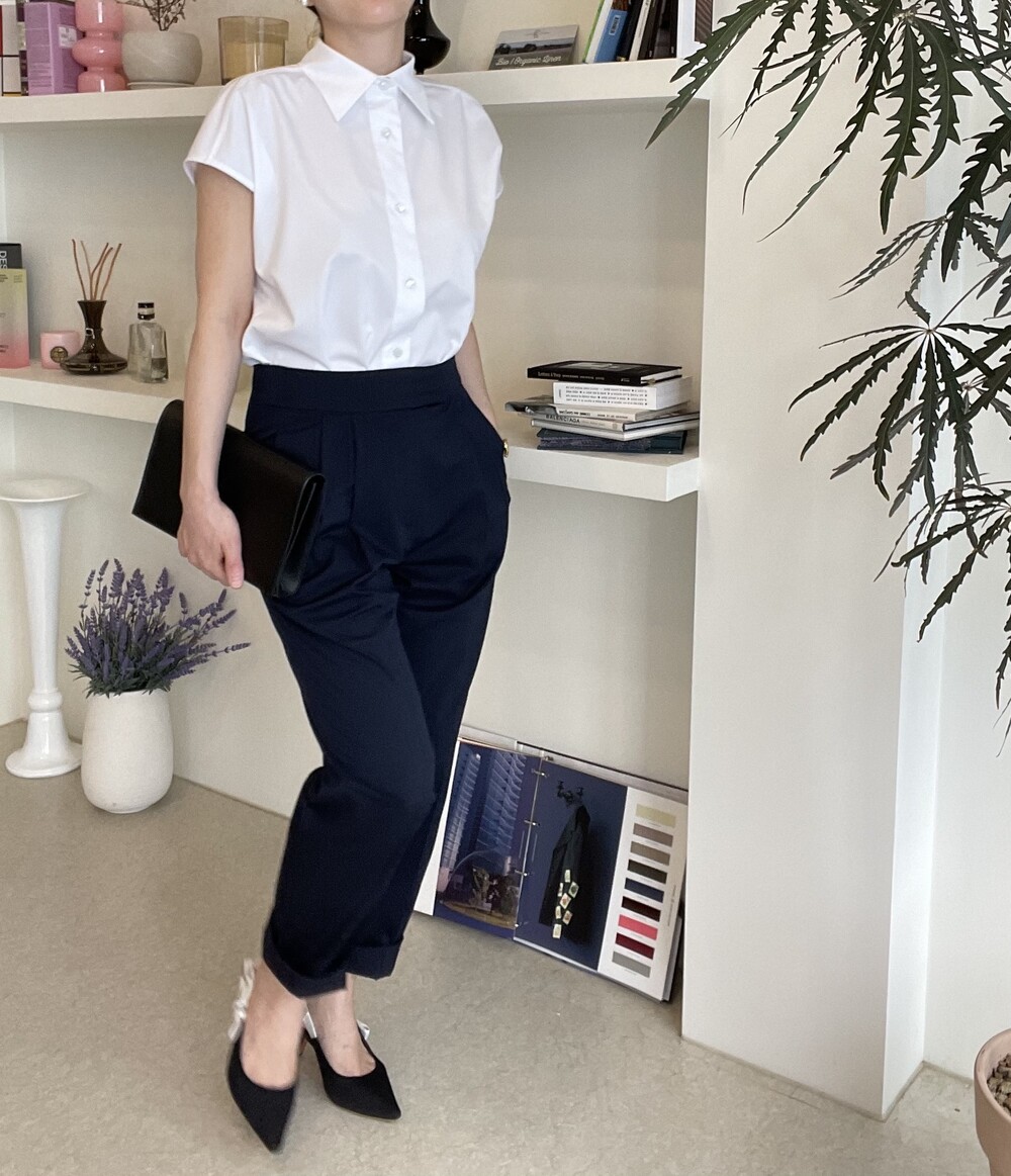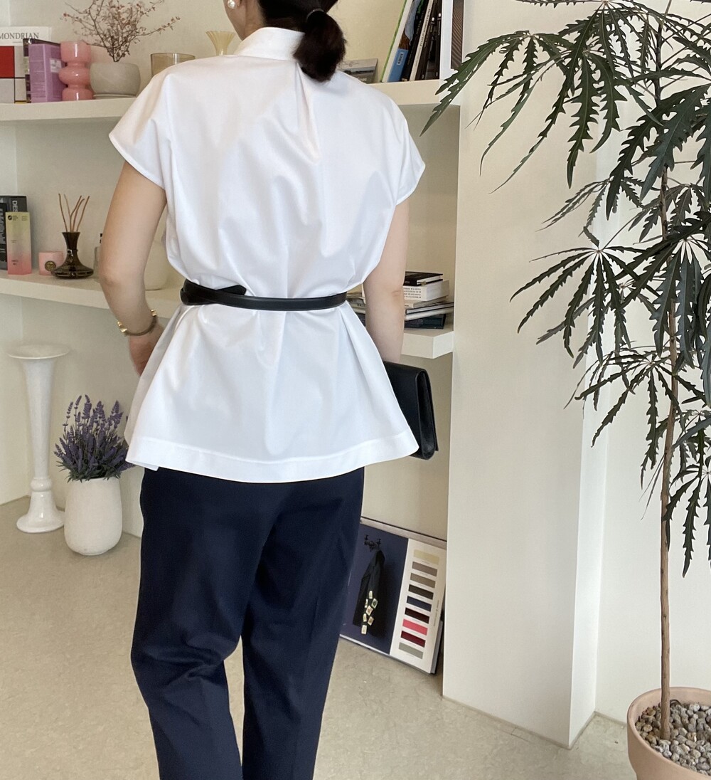22년도 여름에는 새틴소재로 보여드렸던 블라우스였는데, 이번엔 세번수 코튼 혼방소재의 코튼 셋업으로 한여름에도 단정한 셋업 연출이 가능하도록 만들어졌습니다.